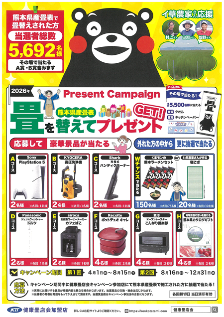 ブログをご覧いただきありがとうございます。本日4月1日より「2026熊本県産畳表キャンペーン」が始まりました。期間内に熊本県産の畳表で畳替えされた方に豪華な景品が当たるキャンペーンです。…